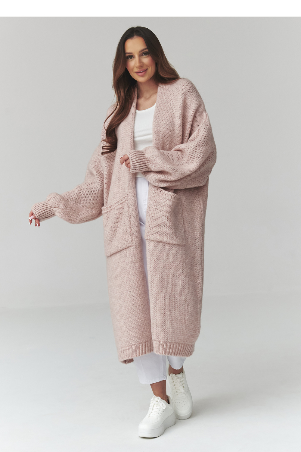 Deze lange dames trui is de perfecte combinatie van comfort, een modieuze uitstraling en functionaliteit. Het oversized cardigan model is ideaal voor dagelijkse outfits, met bewegingsvrijheid en een aangenaam gevoel van omhulling. De losse pasvorm zorgt ervoor dat de oversized trui mooi valt op het lichaam en past bij vele kledingstukken. Gemaakt van aangenaam aanvoelende stof, onderscheidt deze lange dames cardigan zich door zorgvuldige afwerking en een trendy, minimalistisch ontwerp. Praktische grote zakken verhogen de functionaliteit en de langere snit maakt dit model perfect als warme trui voor dagelijks gebruik. Deze modieuze dames trui past zowel bij broeken, leggings als jurken. Dankzij de veelzijdige pasvorm is het een perfecte aanvulling op casual, stedelijke en meer elegante outfits. De dames cardigan trui is een uitstekende keuze voor vrouwen die comfort, stijl en tijdloze mode waarderen.