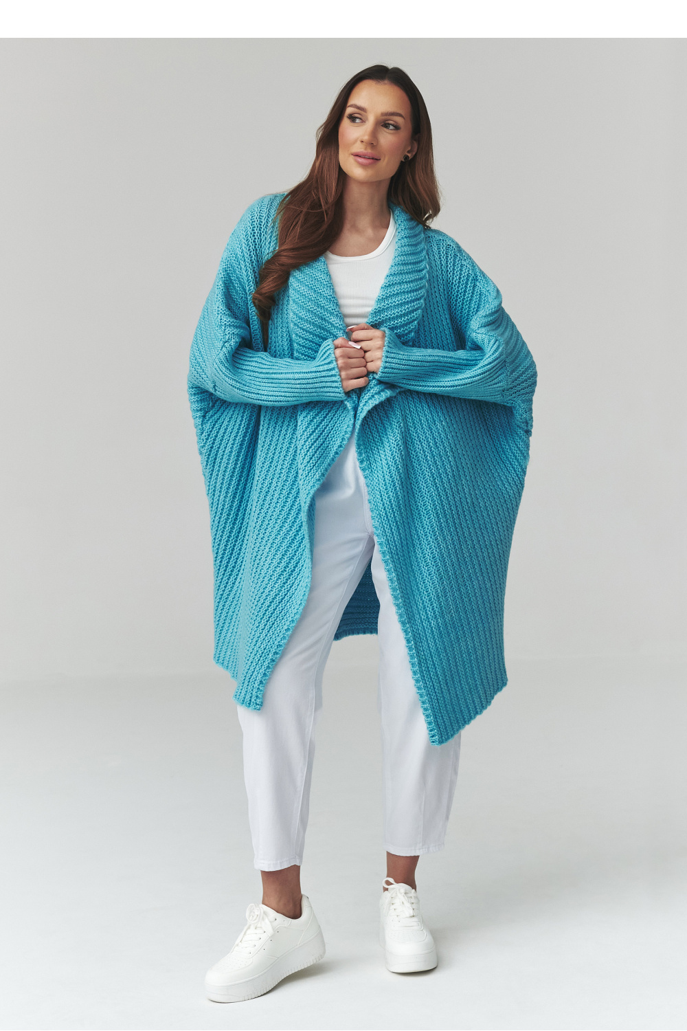 Deze lange dames trui is een uitstekende keuze voor vrouwen die comfort, stijl en tijdloos design waarderen. Het model in de vorm van een dames cardigan onderscheidt zich door de losse pasvorm, waardoor het perfect op het lichaam valt en volledige bewegingsvrijheid biedt. De modieuze oversized trui is ideaal voor zowel dagelijkse outfits als meer elegante combinaties. Gemaakt van aangenaam aanvoelende stof, biedt de dames cardigan comfort en de juiste warmte op koelere dagen. Het kenmerkende materiaal en de langere pasvorm geven hem een unieke uitstraling, waardoor de lange oversized trui perfect past bij broeken, leggings of jurken. Deze veelzijdige trui voor dames kan eenvoudig worden aangepast aan vele outfits, van casual tot meer stedelijke looks. Het is het perfecte kledingstuk voor vrouwen die op zoek zijn naar een modieuze dames cardigan die comfort en stijl combineert.